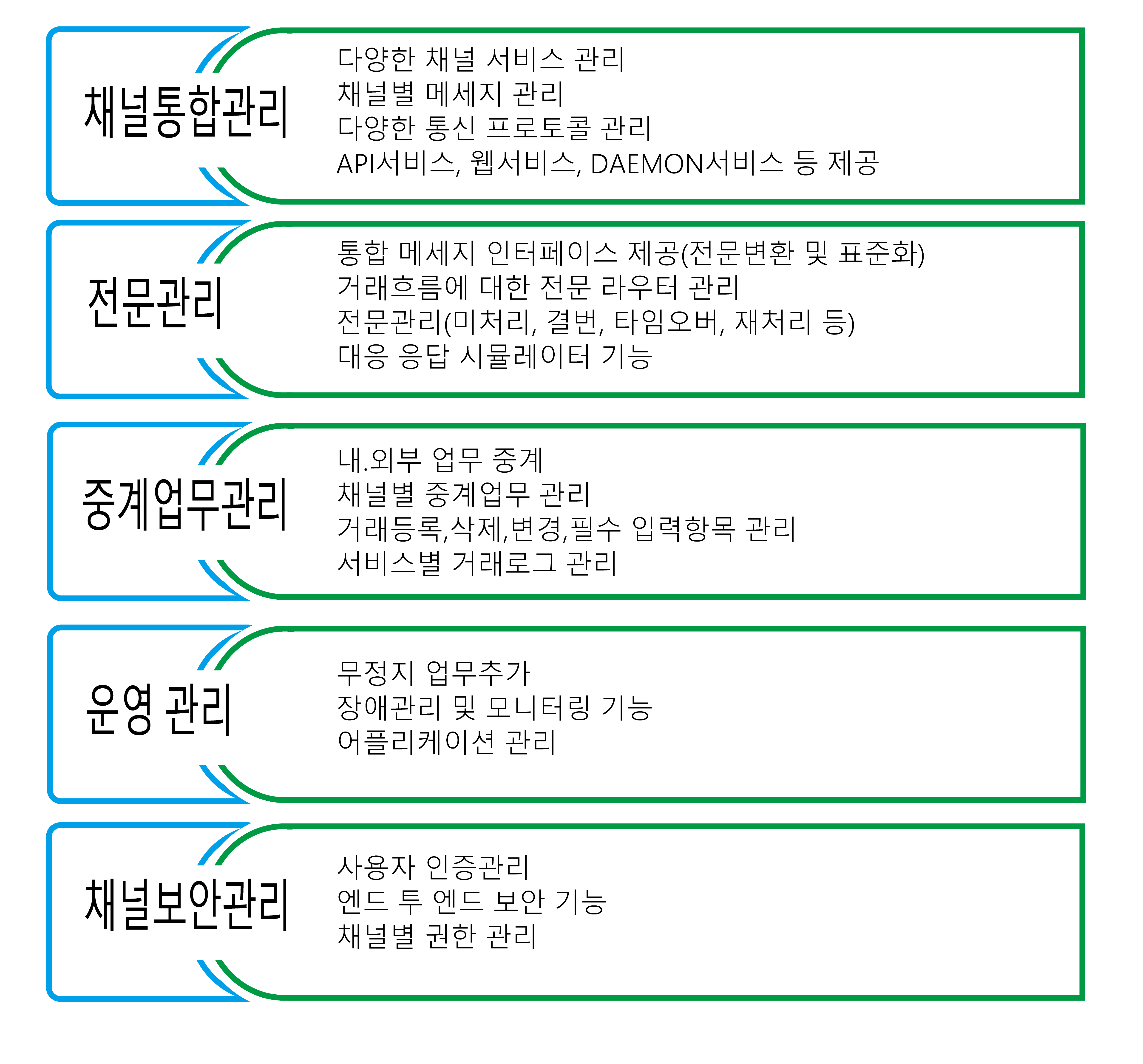 연계되어 있는 채널을 통합 운영 관리하는 시스템이다. 특히 다양한 서버 뿐만 아니라 스마트 디바이스와 데이터 송.수신 그리고 암복호화 등 다양한 서비스를 제공한다.